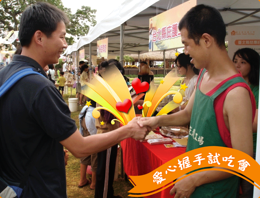 台北縣政府勞工局主辦的「庇護工場-愛心握手試吃會」,於8月3日(六)下午在淡水觀潮藝術廣場與舉行;民眾於活動現場與工場學員握手並給予鼓勵,即可免費品嚐由各家工場所製作的美味甜點,讓民眾能嚐到庇護工場的員工努力做出來的產品,並感受政府對弱勢團體的照顧。
